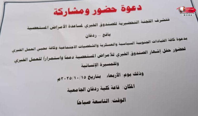 تحت شعار (نحن معكم) دعت اللجنة التحضيرية والإعلامية للصندوق الخيري لمساعدة الأمراض المستعصية (يافع – ردفان) كافة القيادات الجنوبية السياسية والعسكرية والشخصيات الاجتماعية بعموم محافظات الجنوب وكافة محبي العمل الخيري، ورجال المال والأعمال لحضور حفل إشهار الصندوق الخيري للأمراض المستعصية للمساهمة والاشتراك بالصندوق دعما واستمرارا للعمل الخيري وللمسيرة الإنسانية بهدف إيصال الخير للمستحقين.