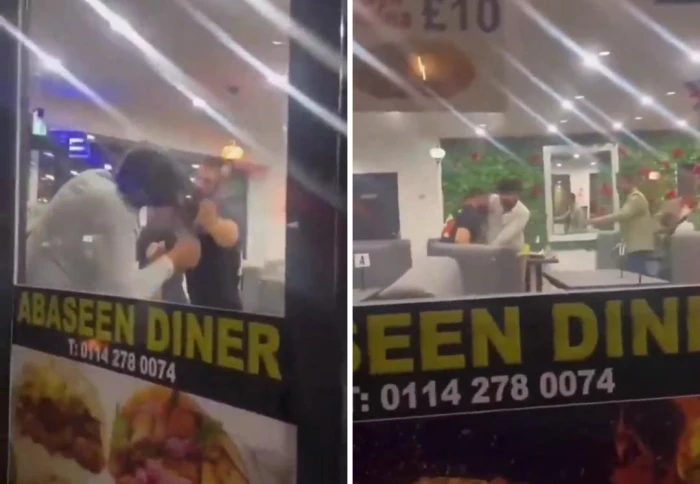 وأمسك صاحب المطعم بعصا حديدية، وبدأ في ضربهم، وقام بلكم أحدهم على وجهه بقوة، حتى فروا من المطعم.