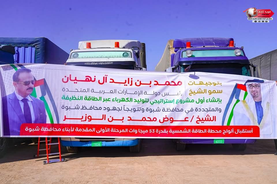 وشهد الأمين العام للمجلس المحلي محافظة شبوة عبدربه هشله ناصر، استلام أكثر من 25 حاوية ضمن الدفعة الاولى من المعدات والألواح الشمسية، حيث ثمن دعم الشيخ محمد بن زايد آل نهيان، رئيس دولة الإمارات، وحكومة وشعب الإمارات.