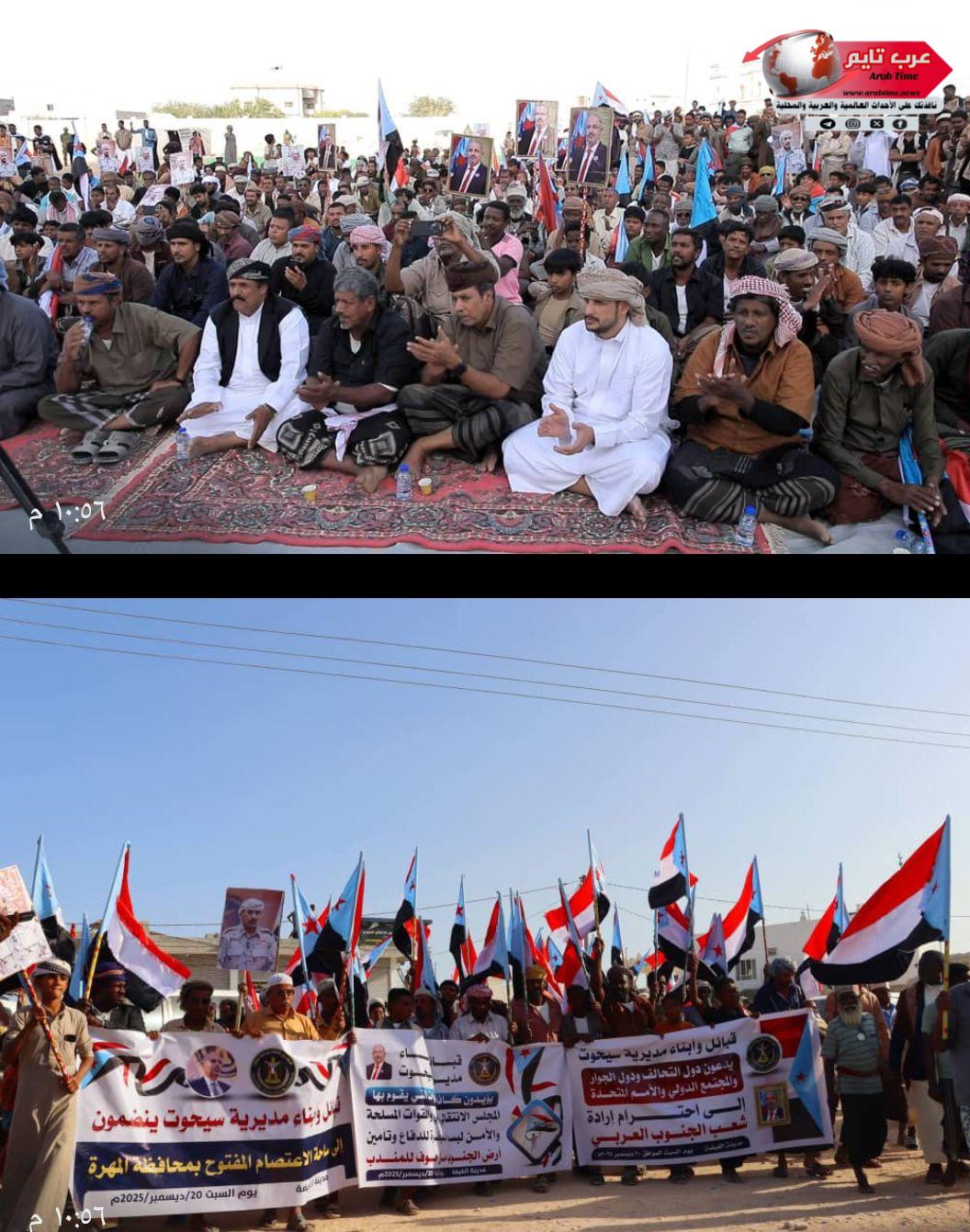 تواصلت فعاليات ساحة الاعتصام الشعبي المفتوح بمدينة الغيضة بمحافظة المهرة، بانضمام حشود جماهيرية كبيرة من أبناء مديرية سيحوت، دعماً لمطالب إعلان دولة الجنوب العربي وتحقيق تطلعات أبناء الجنوب في الحرية والاستقلال.