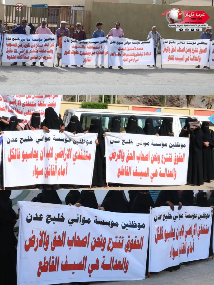نظم عمال مؤسسة موانئ خليج عدن صباح اليوم وقفة حاشدة أمام محكمة الاستئناف احتجاجاً على محاولات الاعتداء على أراض تابعة لعمال المؤسسة، رفع فيها شعارات تندد بالظلم الواقع عليهم من قبل المتنفذين على الارض وعبر المتظاهرون خلال الوقفة عن تمسكهم في الأراضي الممنوحة لهم من قبل الدولة.