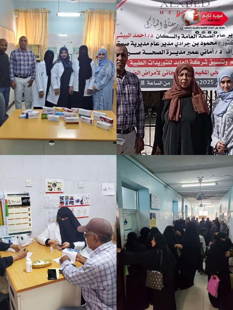 ونشكر الدكتورة أماني عمبر مديرة مكتب الصحة للأشراف والمساندة والدعم بشكل يومي.. كما نتقدم بالشكر والتقدير لشركة العابد للتوريدات الطبية التي تبنت هذا المخيم للتخفيف من معاناة مرضى الأمراض المزمنة (القلب والضغط والسكر) خصوصا في ظل الظروف الاقتصادية الصعبة وارتفاع اسعار هذه الأدوية.. ونتمنى استمرار عمل مثل هذه المخيمات الطبية المجانية لصالح المرضى من أبناء المديرية..