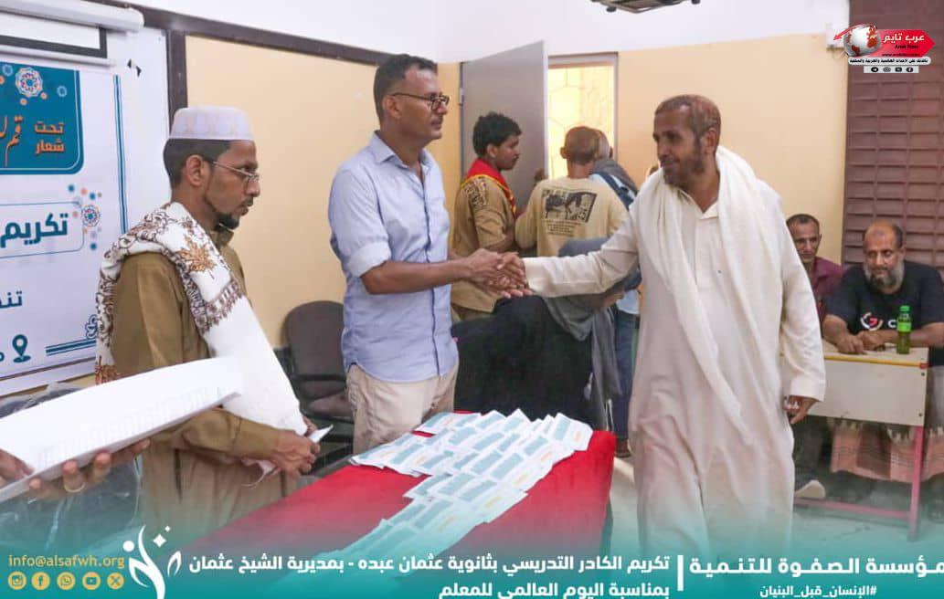 بمناسبة اليوم العالمي للمعلم مؤسسة الصفوة تكرّم الكادر التدريسي بثانوية عثمان عبده بالعاصمة عدن