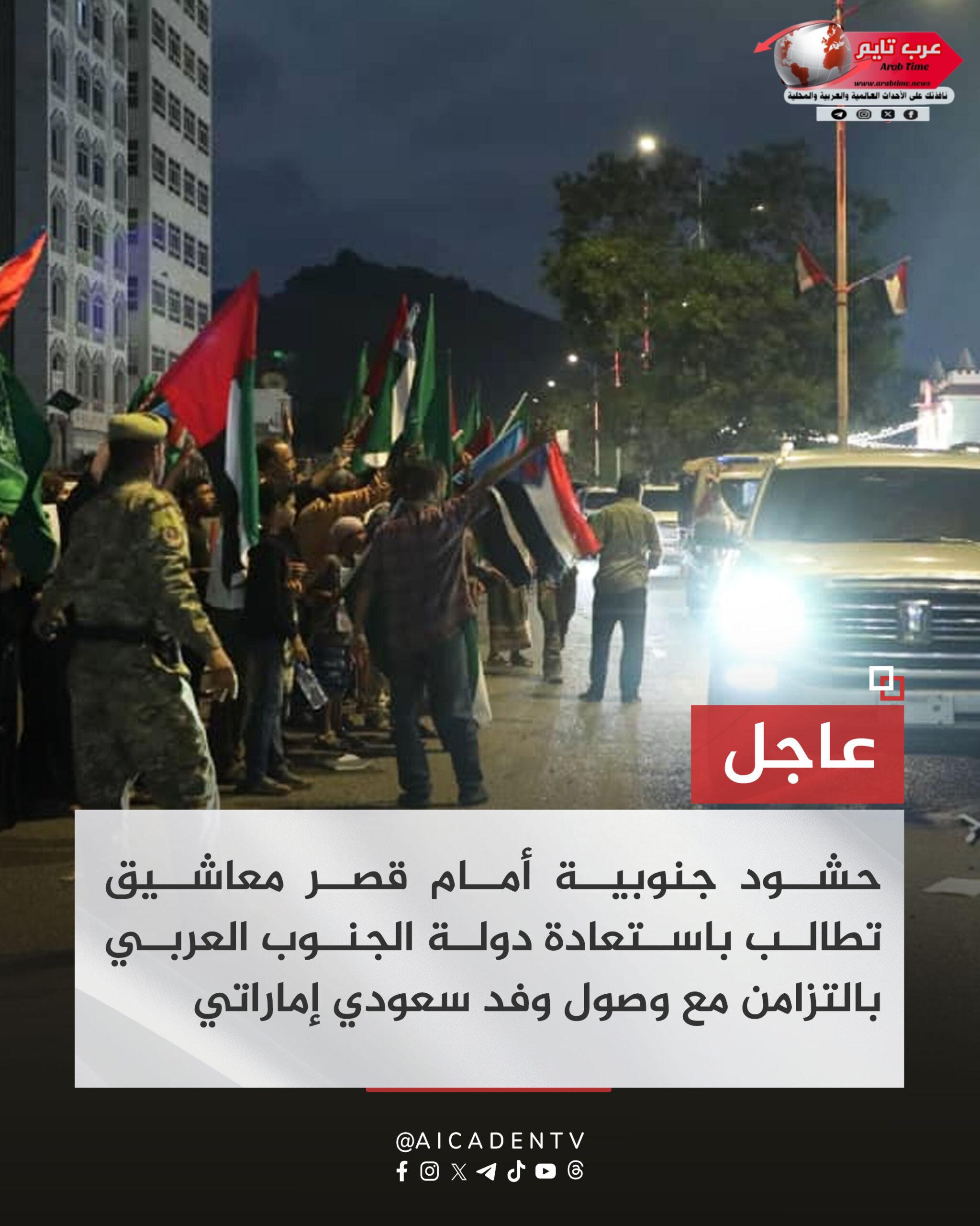 شهدت العاصمة عدن، مساء اليوم، تجمعات جماهيرية واسعة من أبناء الجنوب أمام قصر معاشيق، مؤكدين تمسكهم بحقهم التاريخي في استعادة دولة الجنوب العربي.