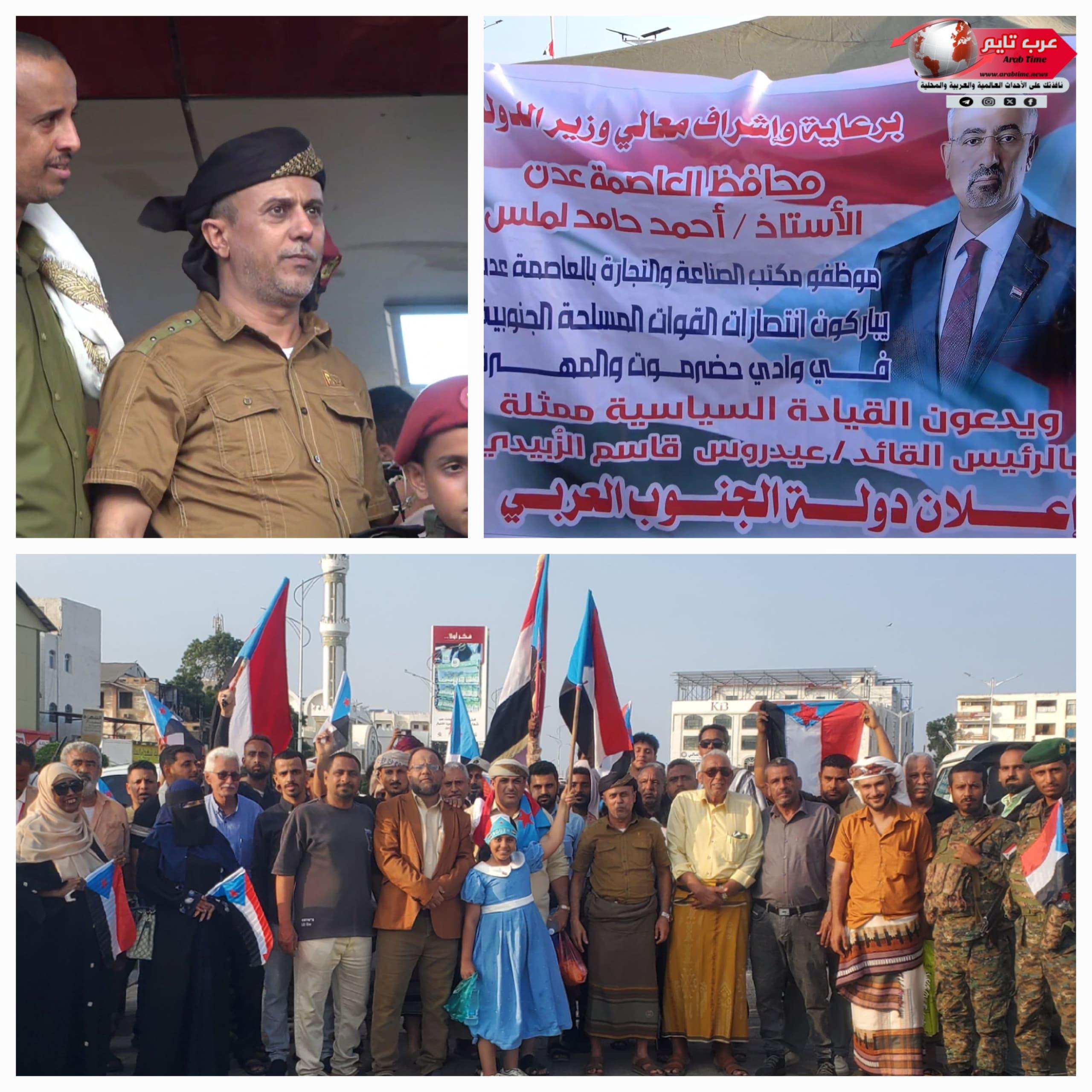 تقدم مدير عام مكتب وزارة الصناعة والتجارة بالعاصمة عدن، العميد وسيم محمد فاضل العُمري، موكباً حاشداً لمنتسبي وكوادر المكتب صوب ساحة العروض بخورمكسر، للمشاركة في الاعتصام المفتوح وتجديد الموقف الوطني الداعم لتطلعات الشعب.