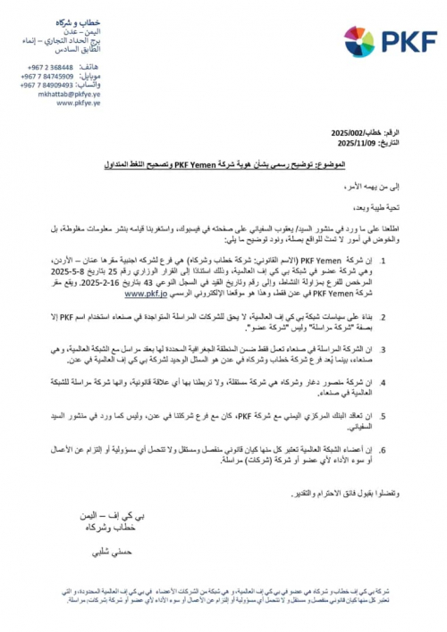 وقالت الشركة في بيانها الصادر بتاريخ 9 نوفمبر 2025 إن ما تم تداوله من معلومات في منشور الصحفي يعقوب السفياني عبر صفحته في فيسبوك، تضمن “مغالطات وخوضًا في أمور لا تمت للواقع بصلة”، مؤكدة أن “PKF اليمن – خطاب وشركاه” هي فرع رسمي لشركة أجنبية مقرها عمّان (الأردن) وعضو في شبكة PKF العالمية، بموجب القرار الوزاري رقم (25) بتاريخ 8 مايو 2025، والمسجلة في السجل النوعي رقم (43) بتاريخ 16 فبراير 2025.