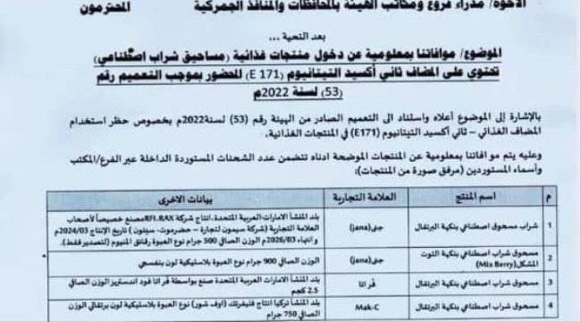 بالإشارة إلى الموضوع أعلاه وبناءً على التعميم الصادر من الهيئة رقم (53) لسنة 2022م بشأن حظر استخدام المادة المضافة للغذاء ثاني أكسيد التيتانيوم (E171) في المنتجات الغذائية