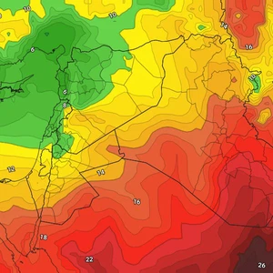 وتشير آخر مخرجات النماذج العددية إلى انخفاض درجات الحرارة الصغرى لتتراوح ما بين 7-10 درجات مئوية فوق قمم المرتفعات الجبلية العالية ومناطق السهول، بينما تكون درجات الحرارة الصغرى أقل من 7 درجات فوق قمم جبال الشراه (تصل إلى قرابة 5 درجات مئوية) وسط أجواء باردة لكنها منعشة.