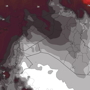 الثلاثاء: المركز اللاهب للكتلة الهوائية اللاهبة يقترب من المملكة مما يؤدي إلى اشتداد الموجة الحارة في يومها الخامس، مع استمرار نشوء حالة من عدم الاستقرار الجوي بعد ساعات العصر، تترافق مع فرص للغبار والرياح الهابطة وبعض الزخات الرعدية من المطر
